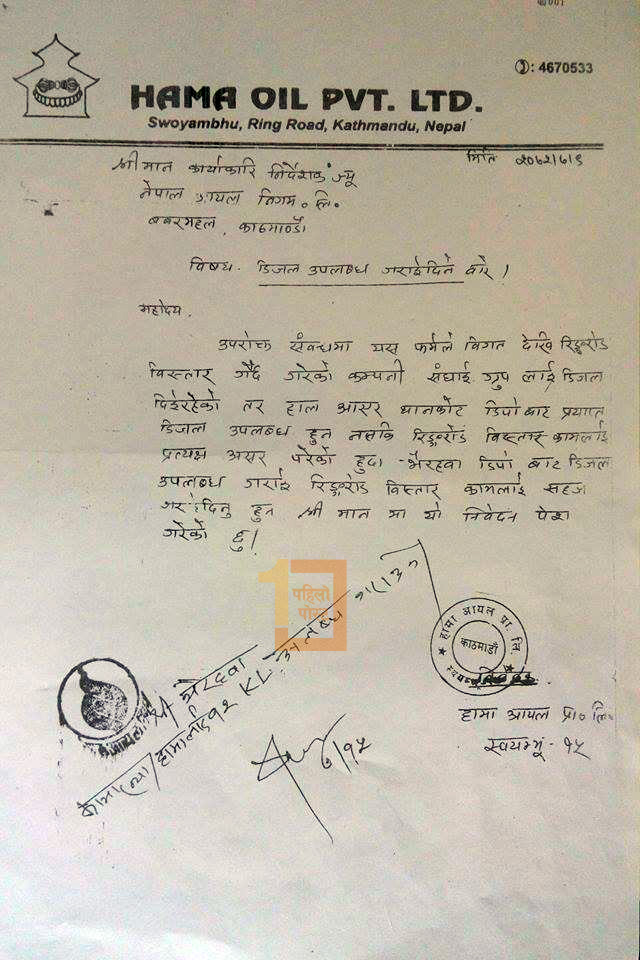 पहिलोपोस्टलाई प्राप्त गोप्य पत्रमा हामा पम्पले रिंगरोड विस्तारको काम गरिरहेको संघाई ग्रुपले पेट्रोलियम पदार्थ नहुँदा काम ठप्प भएको भन्दै आवश्यक इन्धन उपलब्ध गराउन आग्रह गरेको थियो। निगममा संघाईको कुनै पत्र बिना निगमका कार्यकारी निर्देशक खड्काले कातिक १५ गते भलवारी डिपो प्रमुखलाई १२ केएल (१२ हजार लिटर) डिजेल दिन निर्देशन दिएका थिए।