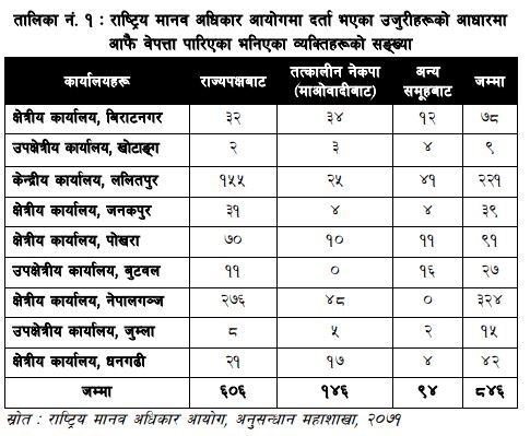 राष्ट्रिय मानव अधिकार आयोगको २०७१ को तथ्याङ्क अनुसार राज्यपक्षबाट द्वन्द्वका क्रममा ६ सय ६ जना र तत्कालीन माओवादीका तर्फबाट १ सय १६ जना बेपत्ता पारिएका थिए।आयोगकी प्रवक्ता मोहना अन्सारीले बेपत्ताका विषयमा मानव अधिकार आयोगमा विगतमा ४ हजारभन्दा धेरै उजुरी परेकोमा खोजतलास गर्दै जाँदा गैरकानुनी थुनामा रहेकाहरुलाई छुटाउँदै जाँदा अहिले ८ सय ३२ जना बेपत्ता रहेको तथ्याङ्क आयोगसँग रहेको बताइन्।