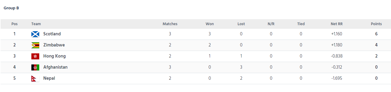 नेपाल र अफगानिस्तान भने यस समूहमा अंक बिहिन छ।