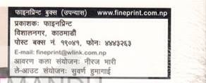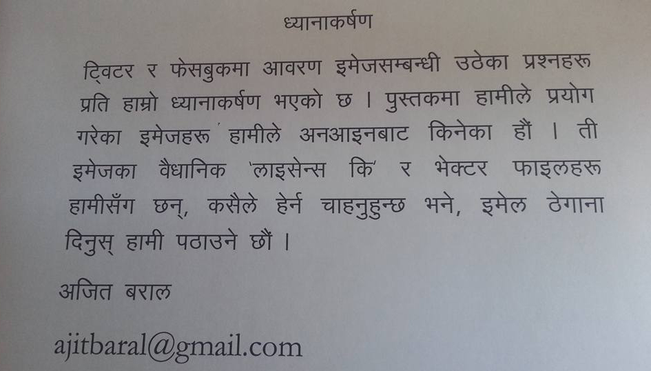 यहाँ भनिएको छः आवरण कला संयोजन नीरज भारीले गरेका हुन् भने लेआउटः सुवर्ण हुुमागाईले। यो जानकारीले के भन्छ भने पुस्तकको आवरण मौलिक छ। तर माथि नै स्पष्ट भैसक्यो कि यो मौलिक होइन।