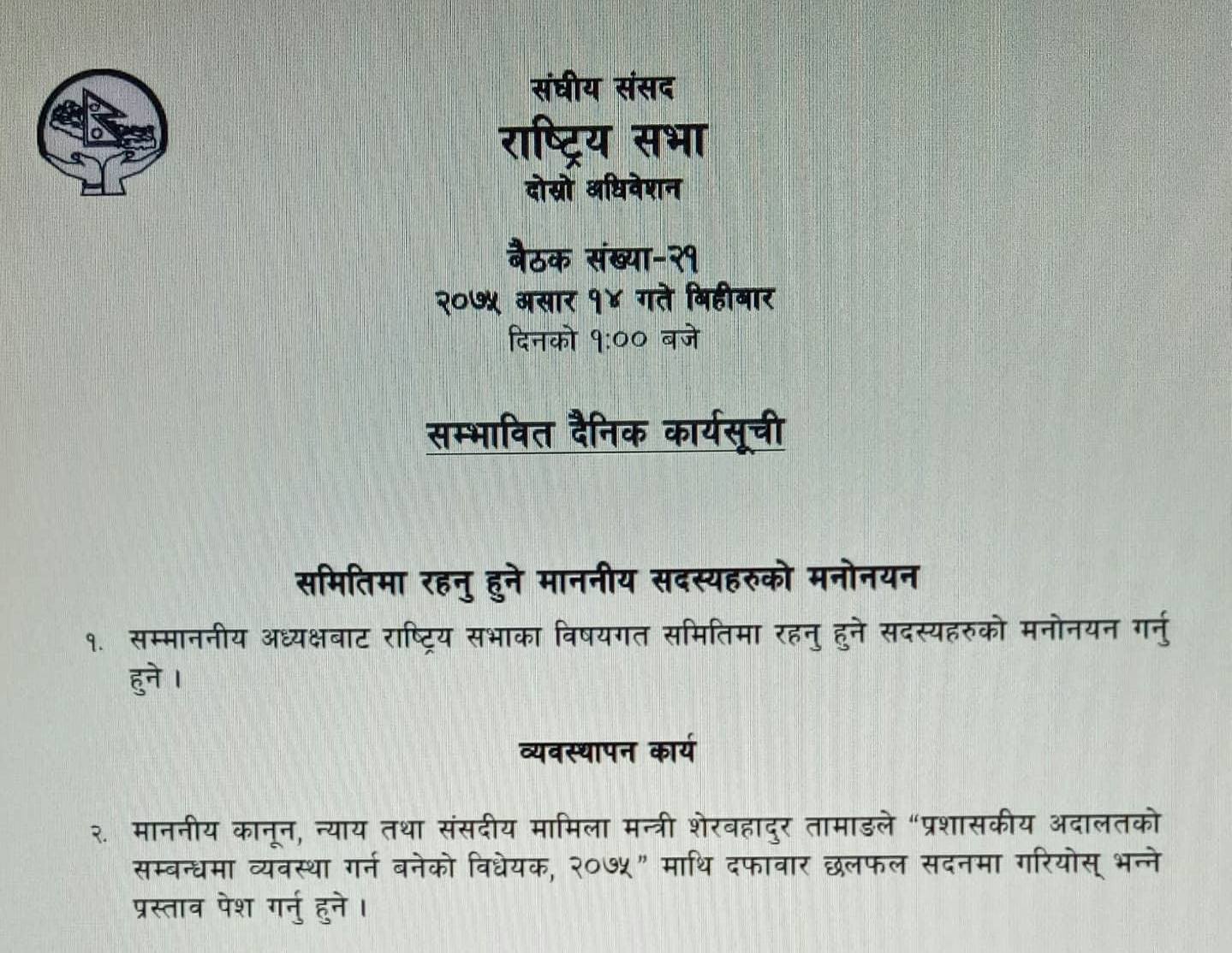 बिहीबार राष्ट्रियसभा बैठकअघि सम्भावित कार्यसूचीमाथि छलफल गर्न कार्यव्यवस्था परामर्श समिति बैठक बस्दैछ। उक्त बैठकमा कार्यसूचीमा सहमति भएमा समिति गठन प्रक्रिया अघि बढ्नेछ।