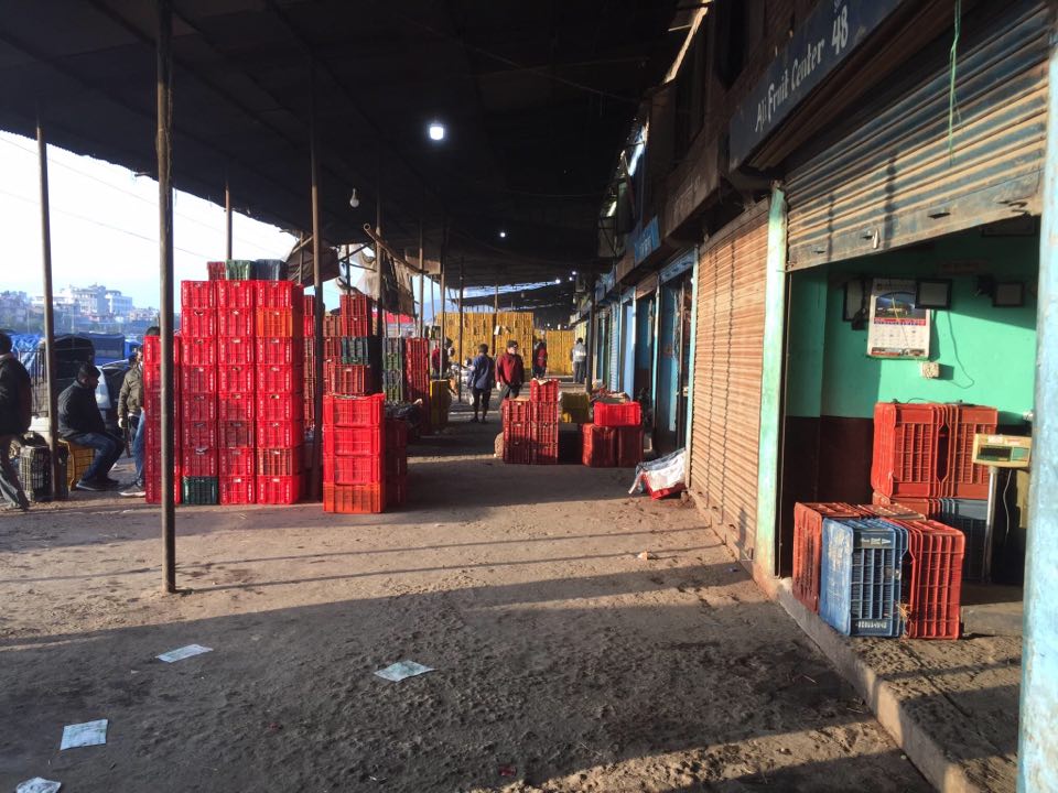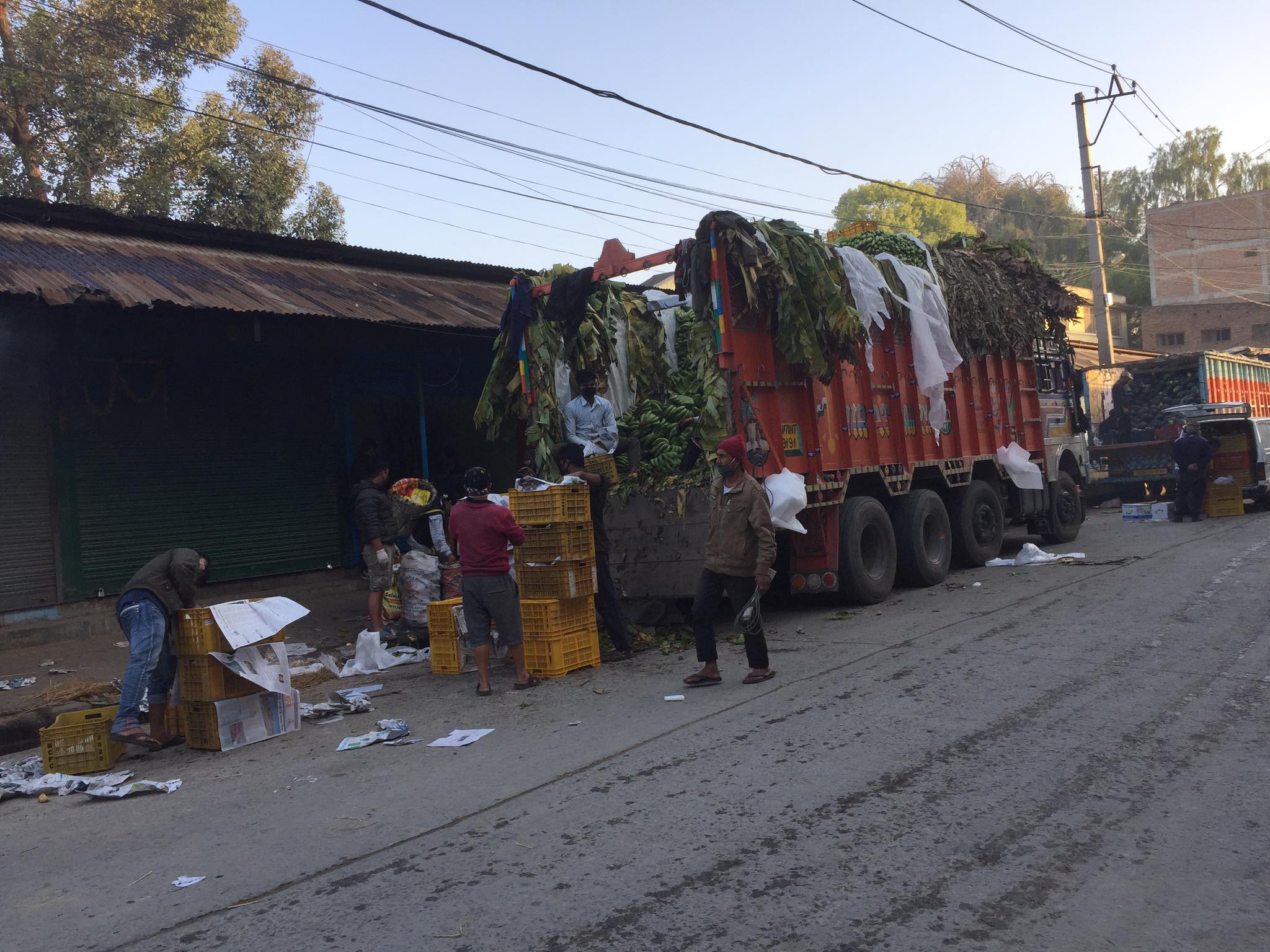 आज बिहान यहाँ पुग्दा केरा र खरबुजा बोकेका ट्रकहरु अनलोड गर्न व्यस्त थिए। बजारका सबै पसल खुला छैनन् जति खुलेका छन् तिनमा फलफूलका भरिएका क्रेटहरु टन्नै देखिन्थे।