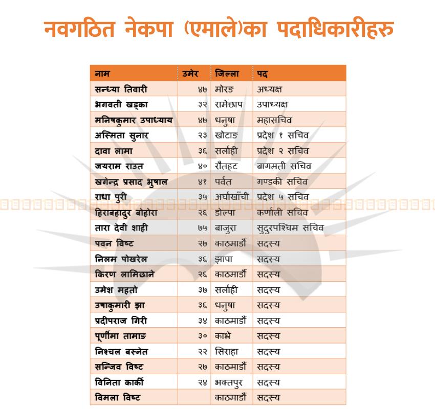 सबैभन्दा बढी उमेरकी तारादेवी शाही छन्। उनी सुदूरपश्चिम प्रदेशकी सचिव हुन्। सिराहाका निश्चल बस्नेत २२ वर्षका छन्। त्यस्तै, प्रदेश १ का सचिवमा रहेकी अस्मिता सुनार खोटङकी हुन्। उनी २३ वर्षकी हुन्। अध्यक्ष सन्ध्या तिवारी मोरङ निवासी रहेको निर्वाचन आयोगमा दर्ता गराएको निवेदनसँगै प्रस्तुत गरेको पदाधिकारीको सूचीमा देखिन्छ। उनी ४७ वर्षकी हुन्।