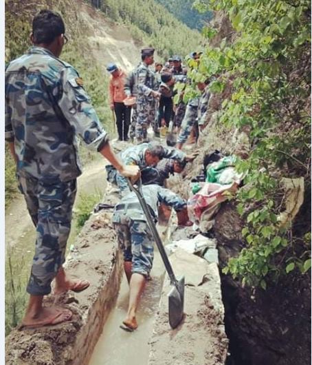 यता नेपाली सेनाले सदरमुकाम खलंगादेखि कालापानी क्षेत्रको छाङरुसम्म बिग्रिएको घोडेटो बाटो निर्माण गरिरहेको छ। घाटीबगरमा क्याम्प खडा गरेर सेनाले ४५० मिटर बाटो मर्मत गर्न लागेको हो। सुख्खा पहिरो हटाउनुपर्ने र चट्टान फुटाउनुपर्ने भएकाले सेनालाई सडक बनाउन समय लागेको छ। असार मसान्तभित्र निर्माण गरिसक्ने सेनाको लक्ष्य छ।