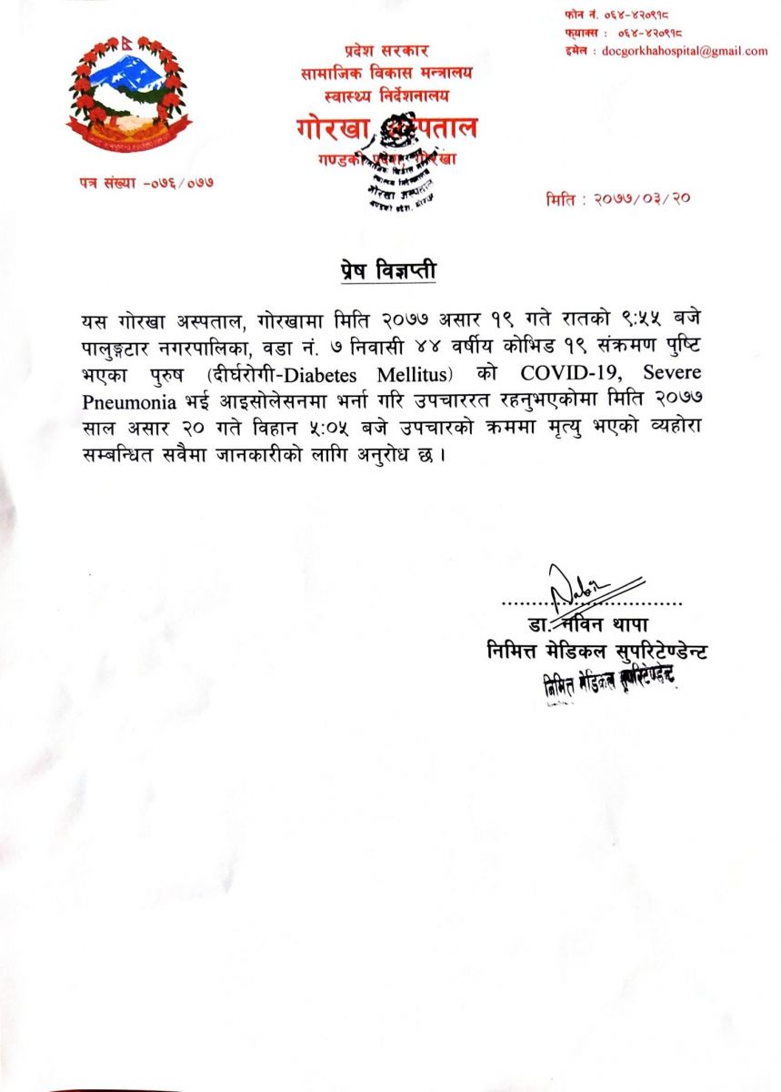 गोरखामा कोरोना संक्रमणबाट भएको यो पहिलो मृत्यु हो। गण्डकी प्रदेशमा यसअघि दुई संक्रमितको मृत्यु भइसकेको छ। नेपालमा मृत्यु हुने कोरोना संक्रमितको संख्या ३३ पुगेको छ।