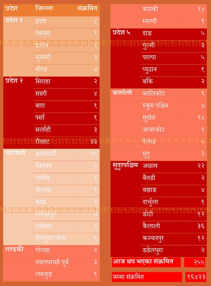 काठमाडौं : बुधवार कोरोना भाइरसका २ सय ५५ जना नयाँ संक्रमित थपिएका छन्। योसँगै देशभर कुल संक्रमितको संख्या १६ हजार ४ सय २३ पुगेको छ। देशभरका विभिन्न २५ प्रयोगशालामा २४ घण्टा भित्र ४ हजार ६ सय ९६ जनाको पीसीआर परीक्षण गर्दा ४३ जिल्लाका २ सय ५५ जनामा संक्रमण पुष्टि भएको हो।