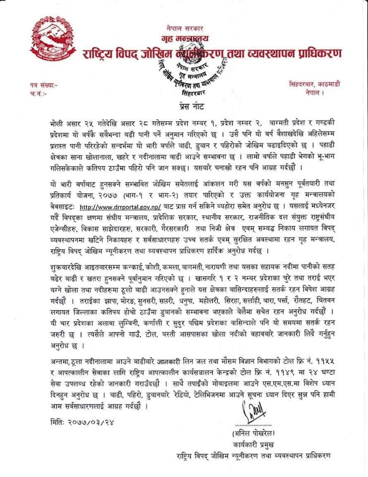 ‘शुक्रवारदेखि आइतवारसम्म कन्काई, कोशी, कमला, वाग्मती, नारायणी तथा यसका सहायक नदीमा पानीको सतह बढेर बाढी र खतरा हुन सक्ने पूर्वानुमान गरिएको छ। खासगरी १ र २ नम्बर प्रदेशका चुरे तथा तराई भएर बग्ने खोला तथा नदीहरुमा ठूलो बाढी आउनसक्ने हुनाले यस क्षेत्रका बासिन्दाहरुलाई सतर्क रहन विषेश आग्रह गर्दछौं,’ प्राधिकरणले भनेको छ।