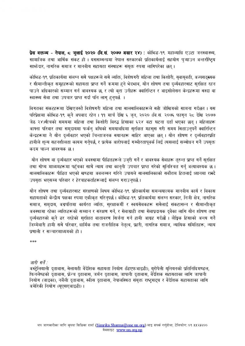 राष्ट्र संघलगायतका विभिन्न देशका दूतावासले बुधवार संयुक्त प्रेस वक्तव्य जारी गर्दै भेदभाव, यौन शोषण तथा दुर्व्यवहारबाट सुरक्षित रहन पाउने अधिकारको सम्मान गर्न कोभिड-१९ प्रतिकार्यमा संलग्न सबै पक्षलाई आग्रह गरेका हुन्। क्वारेन्टाइन र आइसोलेसन केन्द्रहरूमा बस्दा वा स्वास्थ्य सेवा तथा उपचार प्राप्त गर्दा पनि सुरक्षित वातावरण निर्माण गर्न आग्रह गरिएको छ।
