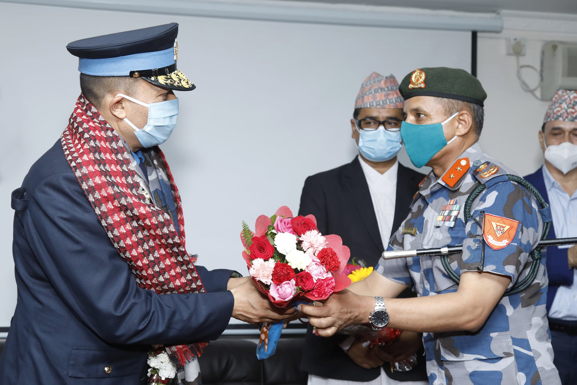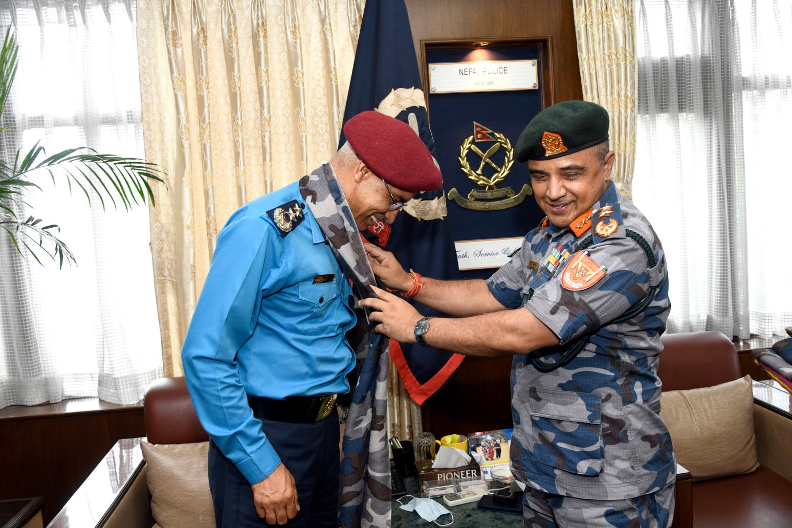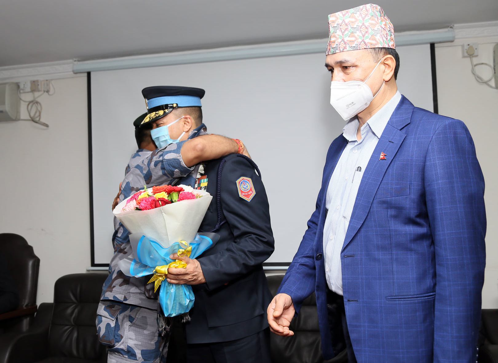 फुल गुच्छासहित पुगेका सशस्त्र प्रहरी अधिकारीले पालैपालो स्वागत गरे। सशस्त्रका आईजीपी खनालले भने थापालाई अंकमाल नै गरेर आत्मियता साटासाटा गरे। खनालको साथमा एआईजीहरु नारायणबाबु थापा, पुष्पराम केसीलगायत थिए। स्वागत समारोहमा नेपाल प्रहरीका एआईजी हरि पाल पनि उपस्थित थिए।