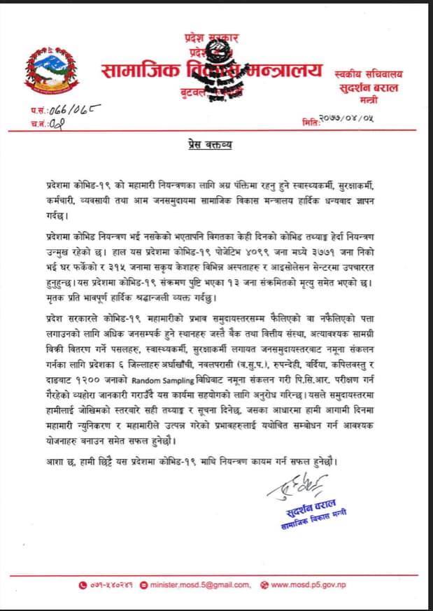 पाँच नम्बर प्रदेशको सामाजिक विकास मन्त्रालयले सोमवार विज्ञप्ति जारी गर्दै १ हजार २ सय ‘र्यान्डम स्याम्पल’ परीक्षण गर्ने जानकारी दिएको छ।