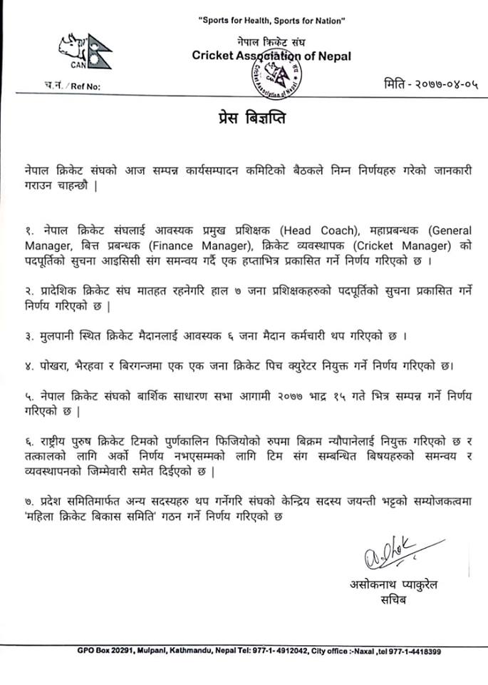 त्यस्तै, विक्रम न्यौपानेलाई पूर्णकालीन फिजियो नियुक्त गर्दै अर्को निर्णय नभएसम्मका लागि टिमसँग सम्बन्धित विषयहरुको समन्वय र ब्यवस्थापनको जिम्मेवारीसमेत दिएको छ।