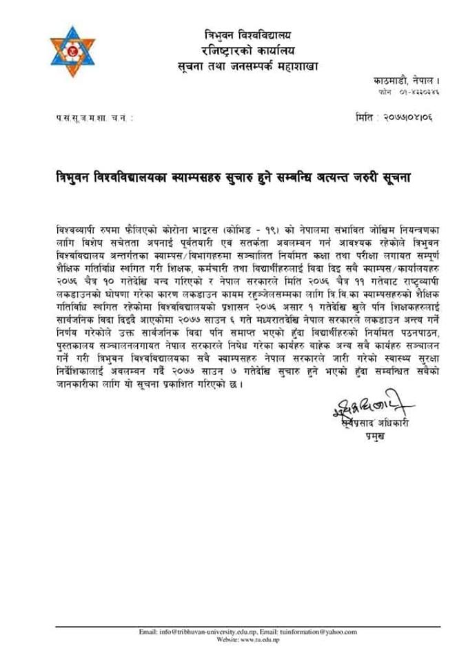 विश्वविद्यालयका सबै क्याम्पसहरु नेपाल सरकारले जारी गरेको स्वास्थ्य सुरक्षा निर्देशिकालाई अवलम्बन गर्दै पुनः सञ्चालन हुने भएका हुन्। विद्यार्थीहरुको नियमित पठनपाठन, पुस्तकालय सञ्चालनलगायत नेपाल सरकारले निषेध गरेका कार्यहरु बाहेक क्याम्पसका अन्य सबै कार्यहरु सञ्चालन हुने छन्। नियमित पठनपाठन नहुँदासम्म वैकल्पिक पठनपाठन भने सञ्चालन हुनेछन्।