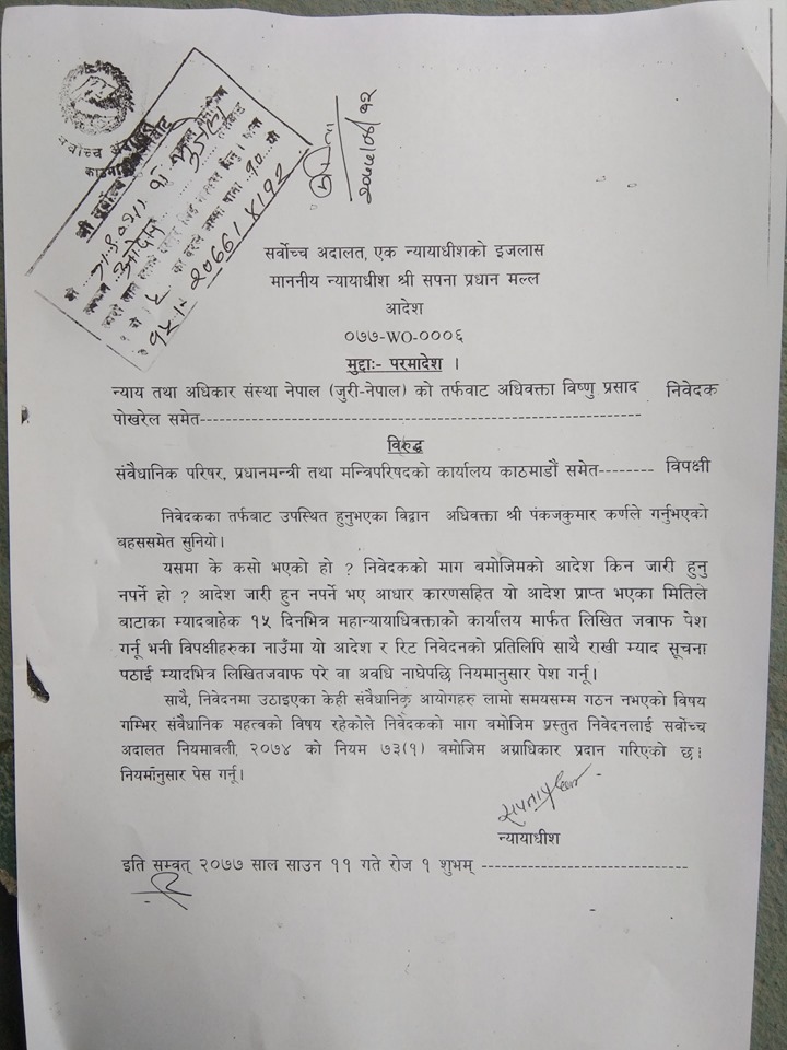 रिट निवेदन जुरी-नेपालको तर्फबाट तथा आफ्नो हकमा समेत अधिवक्ताहरु विष्णुप्रसाद पोखे्रल, मोहनलाल आचार्य, शशी बस्नेत, बालमाया विश्वकर्मा, सुन्दर बहादुर सेनी र कमल बहादुर बसेलले संयुक्तरुपमा दायर गरेका हुन्। यसमा संवैधानिक परिषद्, संवैधानिक परिषद्का अध्यक्ष, संघीय संसद र नेपाल सरकारका मुख्य सचिवलाई विपक्षी बनाइएको छ।