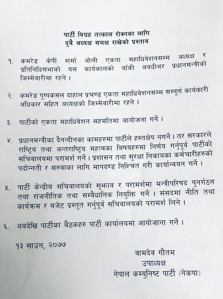 त्यसैगरी एकता महाधिवेशन सहमतिमा गर्ने प्रस्ताव गौतमको छ।