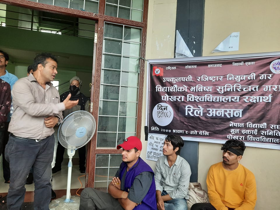 पोखरा विश्वविद्यालयका समस्याहरु यथाशीघ्र समाधान गर्न माग गर्दै विगत ६ दिनदेखि रिले अनशनमा शुरु गरेको थियो। विद्यार्थीको मागमा महामन्त्री वलदेव तिमल्सिनालेसमेत एक्यवद्धता जनाएका छन्। तिमल्सिनाले नेविसंघको माग तत्काल पूरा गर्न सरकारसँग माग गरे।