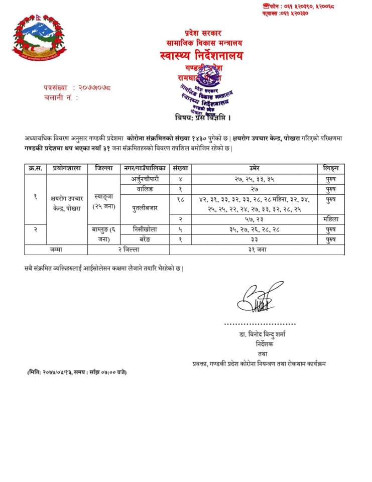 योसँगै प्रदेशमा कुल संक्रमितको संख्या १ हजार ४३० पुगेको छ। संक्रमण पुष्टि भएकाहरुमध्ये स्याङ्जाका २५ तथा बागलुङका ६जना रहेका छन्।