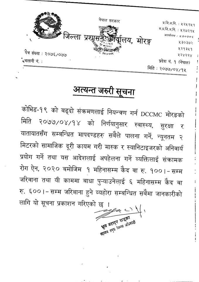 काठमाडौं : जिल्ला प्रशासन कार्यालय मोरङले स्वास्थ्य, सुरक्षा र यातायातसँग सम्बन्धित मापदण्डहरु पालना नगर्नेलाई कारबाही गर्ने भएको छ। जिल्ला संकट व्यवस्थापन समितिको बुधवारको बैठकले सो निणय गरेको सहायक प्रमुख जिल्ला अधिकारी ध्रुवबहादुर खड्काले जानकारी दिए।