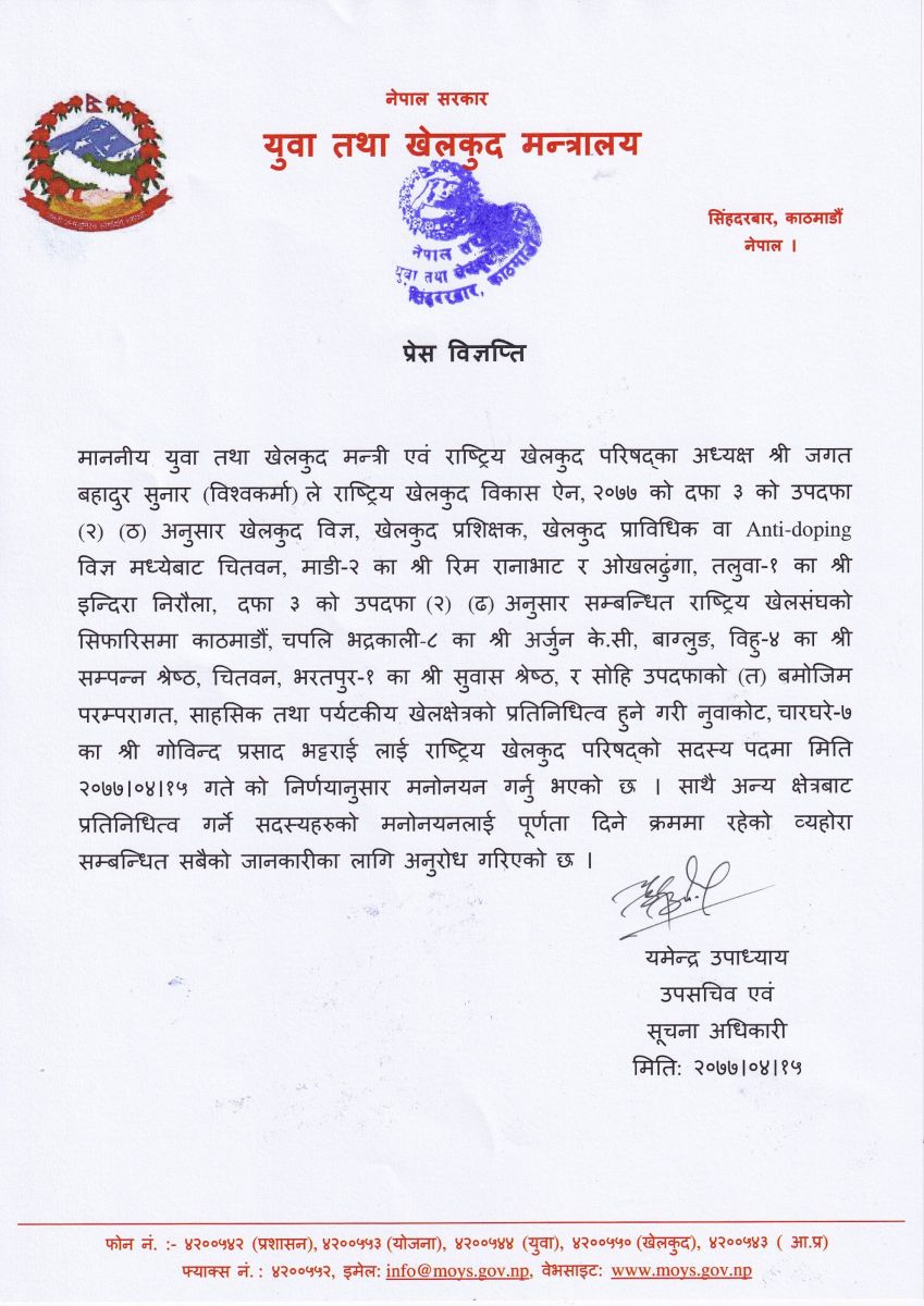 साथै अन्य क्षेत्रबाट प्रतिनिधित्व गर्ने सदस्यहरुको मनोनयनलाई पूर्णता दिने क्रममा रहेको मन्त्रालयको विज्ञप्तिमा उल्लेख छ।