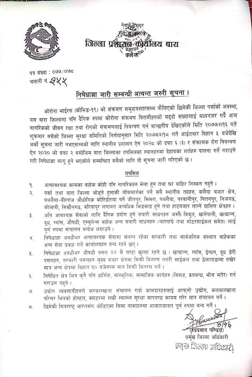 शुक्रवार राति विज्ञप्ति निकाल्दै आइतवारदेखि चारपाग्रे र मोटरसाइकल पूर्णरुपमा सञ्चालनमा बन्देज लगाउँदै कडा रुपमा निषेधाज्ञा पालाना गराउन सरोकारवालाहरुलाई निर्देशन दिएको हो। संकट व्यवस्थापन केन्द्र बाराको शुक्रवार बसेको बैठकले पर्सामा तीव्र गतिमा फैलिरहेको कोरोना संक्रमणलाई मध्यनजर गर्दै बारा जिल्लाका बासिन्दाको जीवन रक्षाको लागि आवश्यक सेवा बाहेकका काम तथा जथाभावी भिडभाड, धार्मिक, सांस्कृतिकमा रोक लगाइएको हो।