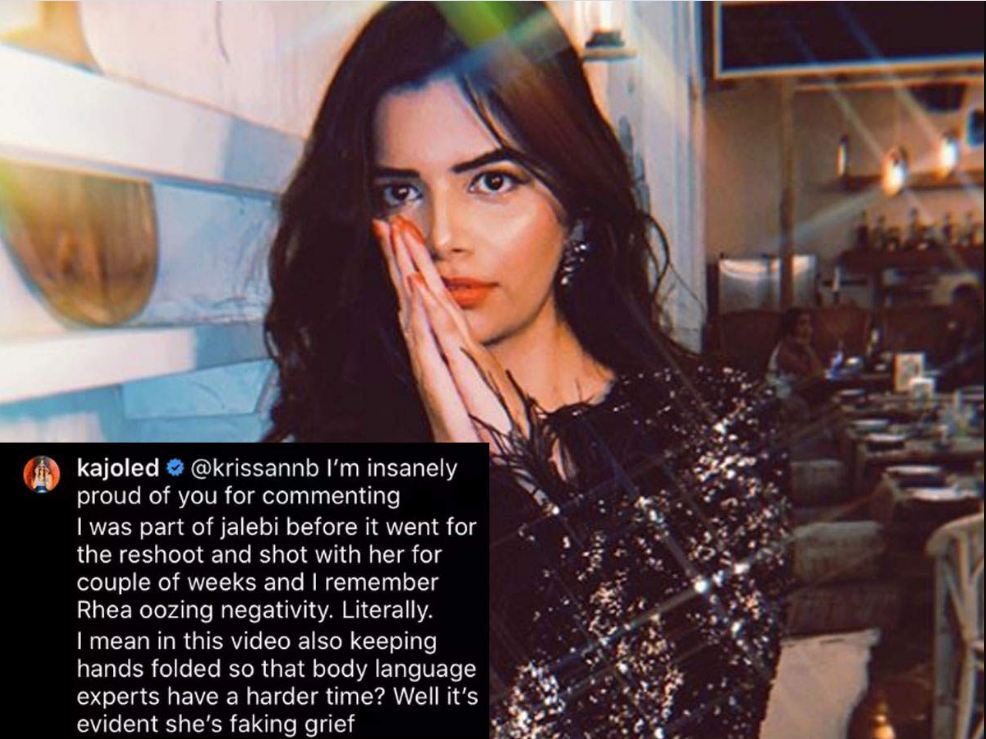 क्रिस्सनको ट्वीटमा कमेन्ट गर्दै काजोलले लेखेकी छन्, ‘जलेबी पुन छायांकन हुनुअघि म यसको हिस्सा थिए। यिनीसँग केही हप्ताका लागि शूटमा गएकी थिए। मलाई याद छ कि रिया कति निगेटिभिटी सोच्थिन्। अहिले भिडियोमा भावुक भएको नाटक गरिरहेकी छन्।’