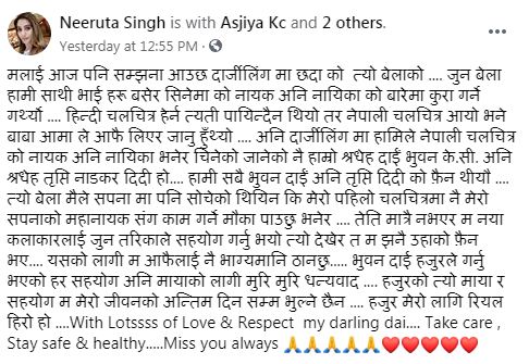 उनले आफूले आजको नभइ त्यस समयको कुरा लेखेको बताएकी छिन्। भनेकी छिन्,' मैले त्यस समयको कुरा गरेकी हुँ जुन बेला राजेश दाइले पनि नेपाली चलचित्र जगतमा पाइला राखेका थिएनन्।'