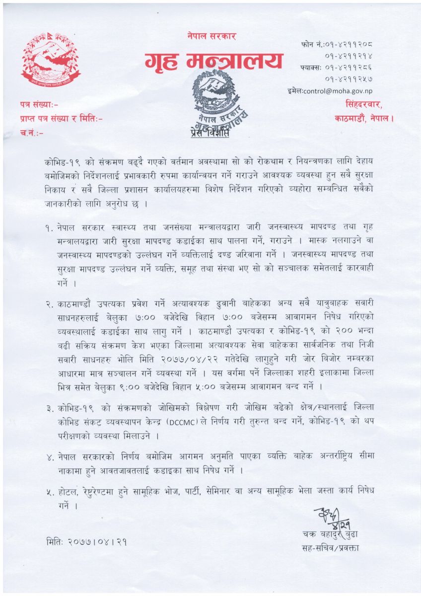 यस्तै, ढुवानी बाहेकका अन्य यात्रुबहाक सवारी साधनलाई बेलुका ७ बजेदेखि बिहान ७ बजेसम्म उपत्यका प्रवेशमा कडाइ गर्ने निर्णयलाई यथावत राखिएको छ।