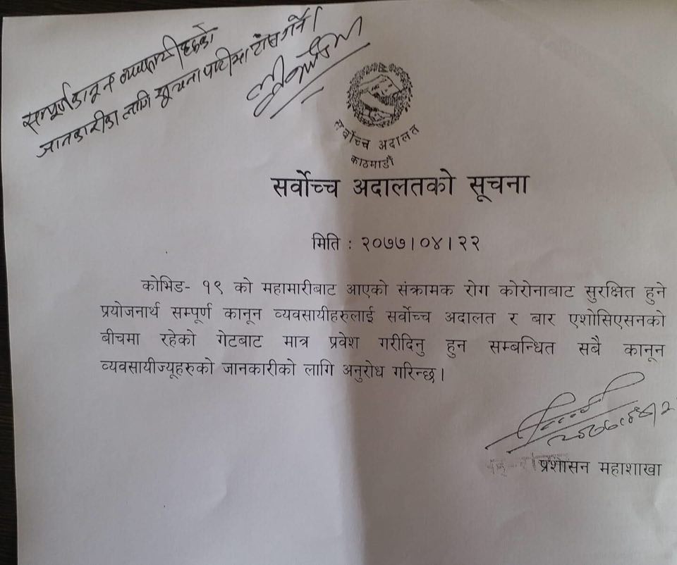 कोभिड १९ संक्रमणको जोखिमलाई मध्यनजर गर्दै सर्वोच्चको प्रशासन महाशाखाले बिहीवार सूचना प्रकाशित गरेर वकिलहरुका लागि गेट तोकेको हो। अब कानुन व्यवसायीहरुले सर्वोच्च अदालत र बार एशोसिएसनको बीचमा रहेको गेटबाट मात्र प्रवेश गर्नुपर्नेछ।