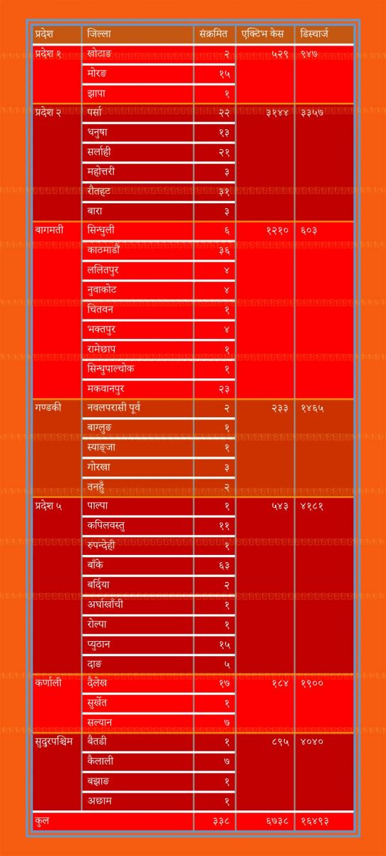 काठमाडौं : पछिल्लो २४ घण्टामा काठमाडौं उपत्यकामा ४४ जनासहित देशभर ३३८ जनामा कोभिड-१९ को संक्रमण पुष्टि भएको छ।