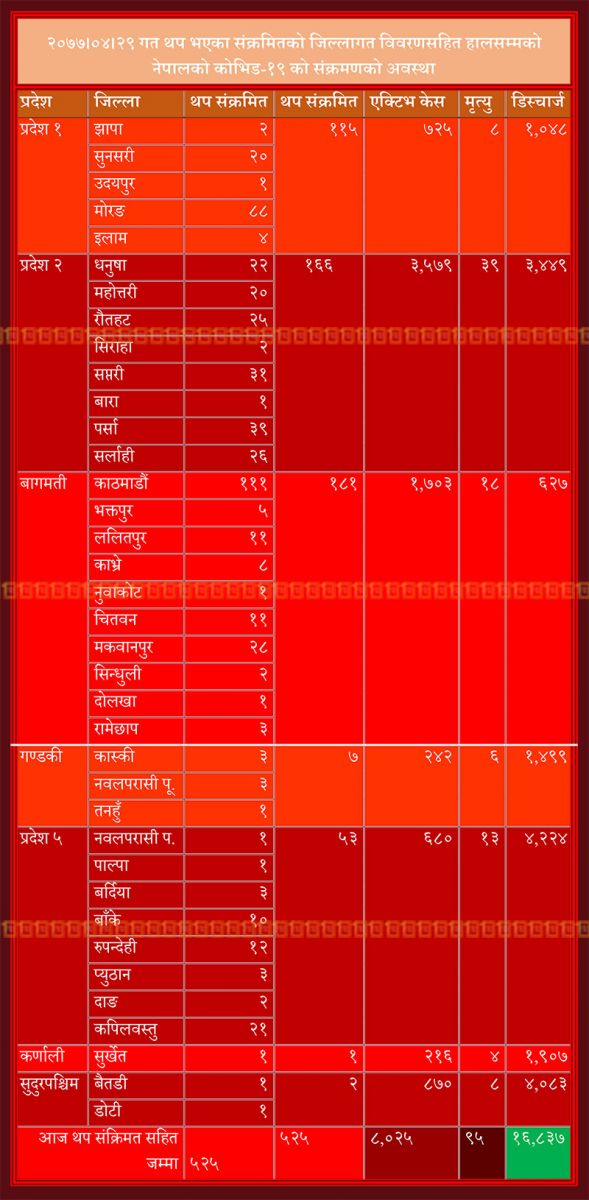 काठमाडौं : पछिल्लो २४ घण्टामा ५२५ जनामा कोभिड-१९ संक्रमण पुष्टि हुँदा काठमाडौं उपत्यकामा मात्र १२७ जनामा संक्रमण देखिएको छ।
