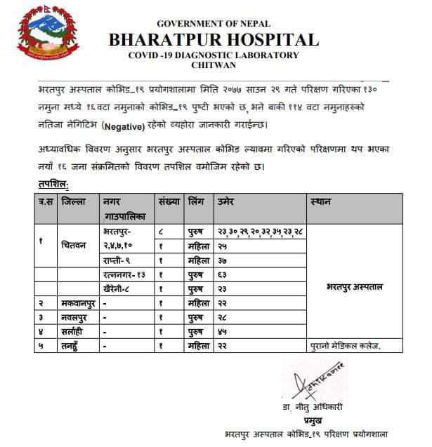 काठमाडौं : चितवनको भरतपुर अस्पताल कोभिड १९ प्रयोगशालामा साउन २९ गते १ सय ३० जनाको नमुना परीक्षण गर्दा १६ जनामा कोरोना भाइरस पोजेटिभ भेटिएको छ।