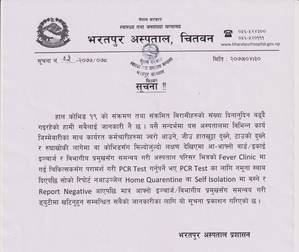 काठमाडौं : अस्पतालमा कार्यरत स्वास्थ्यकर्मी तथा कर्मचारीहरुमा कोभिड-१९ को संक्रमण पुष्टि हुन थालेसँगै भरतपुर अस्पतालले आफ्ना स्वास्थ्यकर्मी तथा कर्मचारीलाई सतर्कता अपनाउन अनुरोध गरेको छ। कर्मचारीलाई संक्रमणसम्बन्धी लक्षण देखिए कोभिड-१९ परीक्षण गराउन अनुरोध समेत गरेको छ।