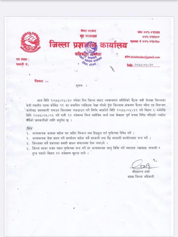 काठमाडौँः कोरोना संक्रमित बढेपछि दोलखामा लकडाउन गरिएको छ। जिल्ला संकट व्यवस्थापन समितिको शुक्रबारको बैठकले भदौ ६ गतेसम्म लकडाउन गर्ने निर्णय गरेको हो। शुक्रबारमात्र गौरीशंकर गाउँपालिकामा थप पाँच जना संक्रमित फेला परेका थिए। जसमा तीन जना गाउँपालिकामा कार्यरत कर्मचारी छन्।