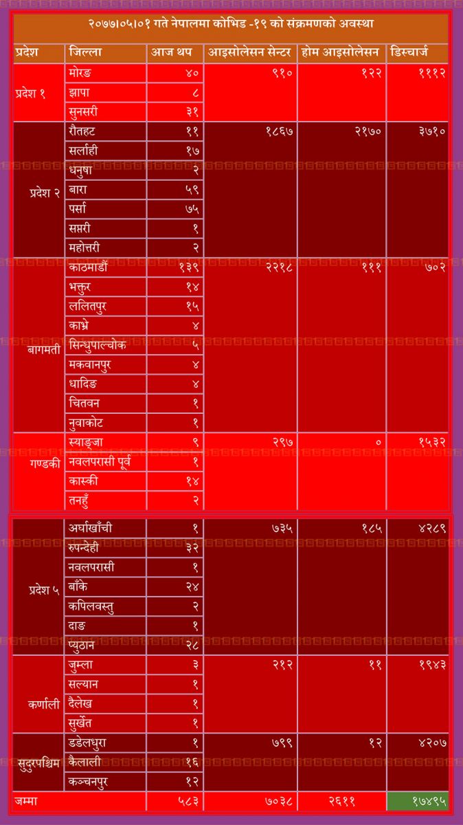 पछिल्लो २४ घण्टामा संक्रमण पुष्टि हुनेमा सबैभन्दा बढी वाग्मती प्रदेशमा १८७ जनामा संक्रमण पुष्टि भएको छ। त्यस्तै, प्रदेश २ मा १६७ र प्रदेश ५ मा ८९ जनामा संक्रमण पुष्टि भएको छ। प्रदेश १ मा ७९ जनामा संक्रमण पुष्टि भएको मन्त्रालयको तथ्यांकमा उल्लेख छ।