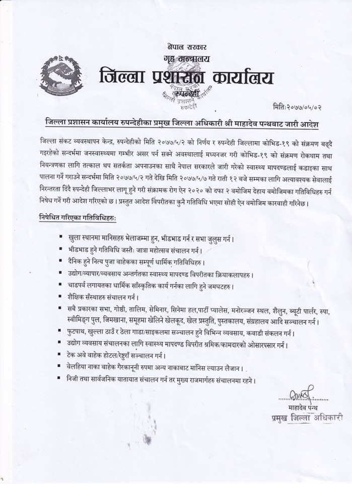 मंगलवार (भदौ २)देखि भदौ ७ गते राति १२ बजेसम्मका लागि 'अत्यावश्यक सेवालाई निरन्तरता दिँदै रुपन्देही जिल्लाभर लागू हुने गरी संक्रामक रोग ऐन २०२० को दफा २ वमोजिम देहाय बमोजिमका गतिविधिहरु गर्न निषेध गर्ने गरी आदेश गरिएको छ,' प्रजिअ पन्थले जारी गरेको आदेशमा उल्लेख छ।