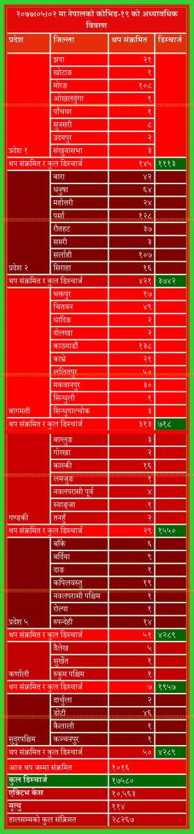 ४७ जिल्लामा संक्रमण पुष्टि भएका छन्। काठमाडौं उपत्यकाका मात्र २०५ जना रहेका छन्। जसमध्ये काठमाडौंमा १३८, ललितपुरमा ५० र भक्तपुरमा १७ जना कोभिड-१९ का संक्रमित पहिचान भएका छन्।