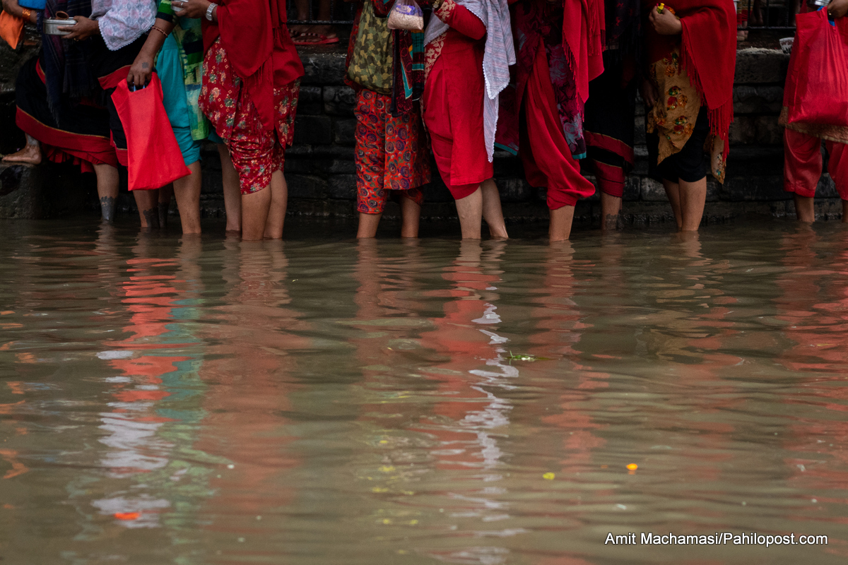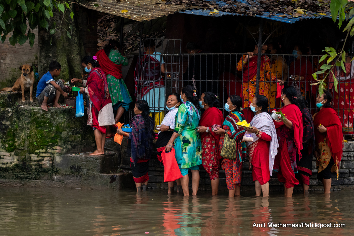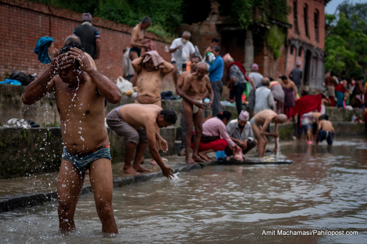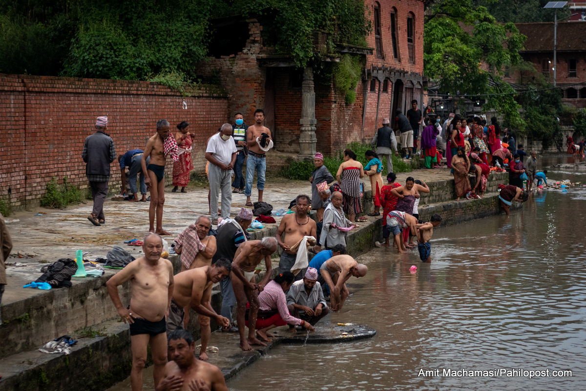 आज कुशे औंशी। भक्तपुरको हनुमन्ते खोलामा मानिसहरुको बिहानैदेखि चहलपहल देखियो। स्नान तर्पण तथा पिण्डदान गर्नका लागि खोलामा मानिसहरु पुगेका थिए। कोरोना भाइरसको संक्रमणका कारण निषेध गरिए पनि मानिसहरु खोलामा नुहाउन र पूजाआजाका लागि पुगेका थिए। बिहानको दृष्य यस्तो थियो -