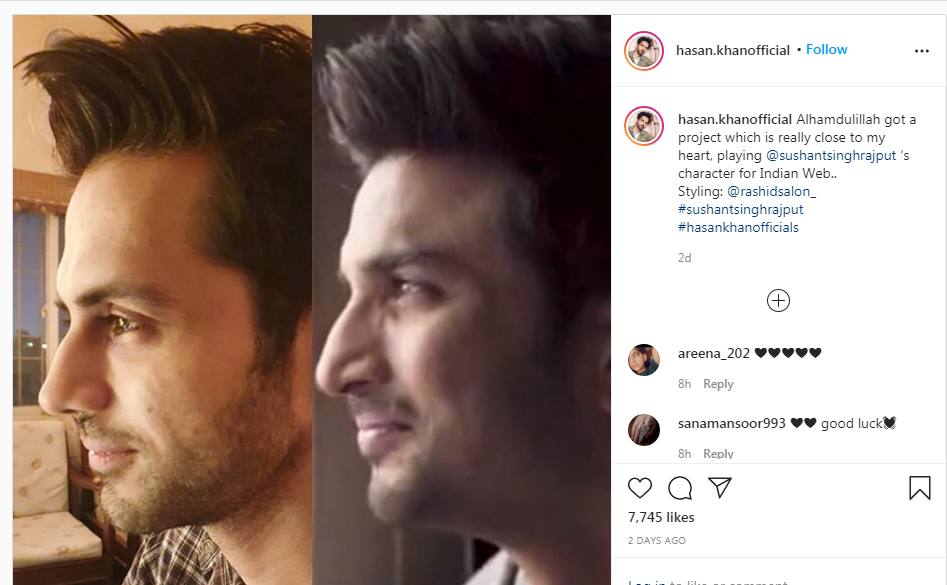 हसन खानले बुधवार आफ्नो इन्स्टाग्राम ह्यान्डलमार्फत् आफू सुशान्तमाथि बन्ने वेब सिरिजका लागि अनुबन्धित भएको जानकारी दिएका थिए।