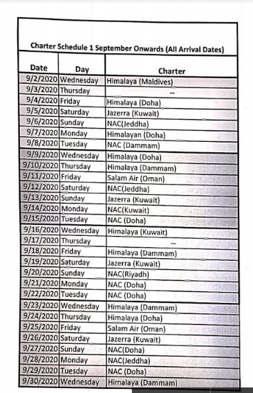 त्यस्तै सेप्टेम्बरभर २७ वटा चार्टड उडान गरी विदेशमा रहेका नेपालीलाई स्वदेश फर्काउन मन्त्रालयले अनुमति दिएको छ। जसअन्तर्गत सेप्टेम्बर २ मा हिमालय एयरलाइन्स माल्दिभ्स उड्ने छ। दोहा, कुवेत, जेद्दा, दमाम, ओमान र रियादका लागि चार्टड उडान तालिका स्वीकृत भएको छ।