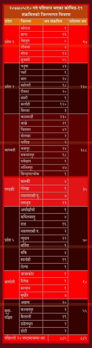 काठमाडौं : पछिल्लो २४ जिल्लामा ४६ जिल्लामा कोभिड-१९ का संक्रमित पहिचान भएका छन्। देशभरका प्रयोगशालामा भएको १३ हजार २०० नुमना परीक्षणका क्रममा ८८५ जनामा कोभिड-१९ को संक्रमण पुष्टि भएको स्वास्थ्य तथा जनसंख्या मन्त्रालयका प्रवक्ता डा जागेश्वर गौतमले जानकारी दिए।