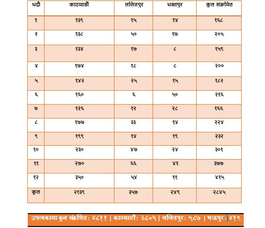 यस्तै १२ दिनमा ललितपुरमा ३५७ जना र भक्तपुरमा २४९ जना संक्रमित थपिए। भदौमा मात्रै उपत्यकामा कूल २ हजार ८४५ जनामा संक्रमण पुष्टि भएको छ।