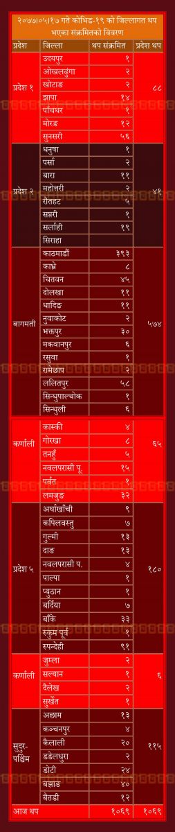 हाल मोरङ, सुनुसरी, धनुषा, पर्सा, बारा, महोत्तरी, रौतहट, सर्लाही, काठमाडौं, रुपन्देही, चितवन र, ललितपुर गरी १२ जिल्लामा ५०० बढी सक्रिय संक्रमित रहेका छन्। भने सोलुखुम्बु, मुस्ताङ, मुगु, हुम्ला र डोल्पामा शून्य संक्रिय संक्रमित रहेका छन्।
