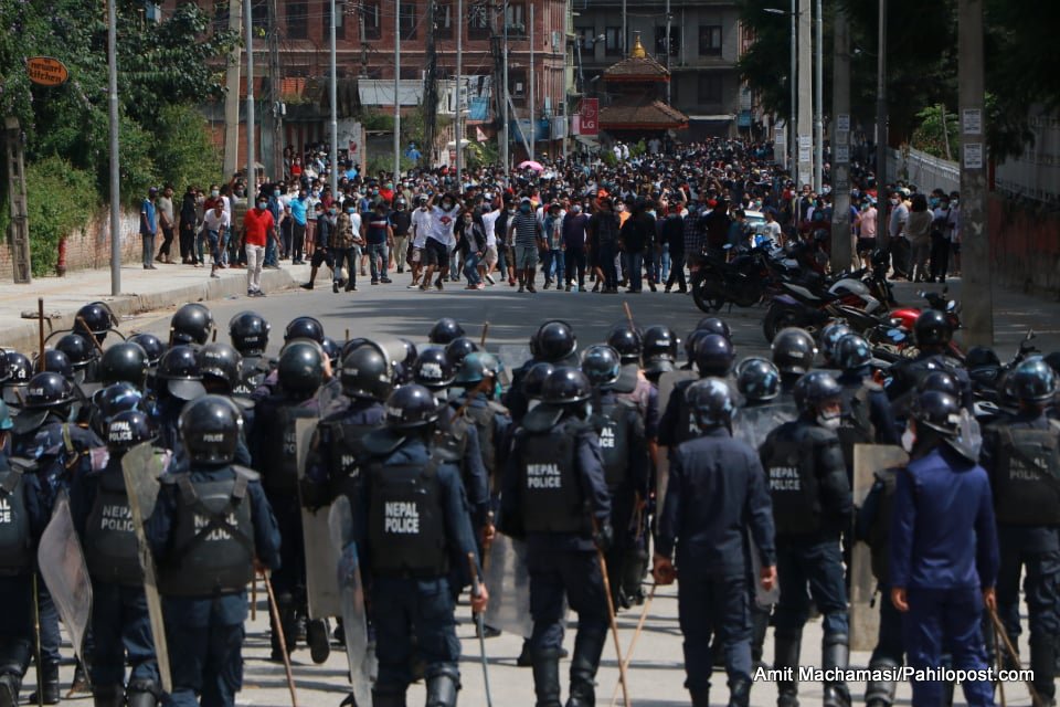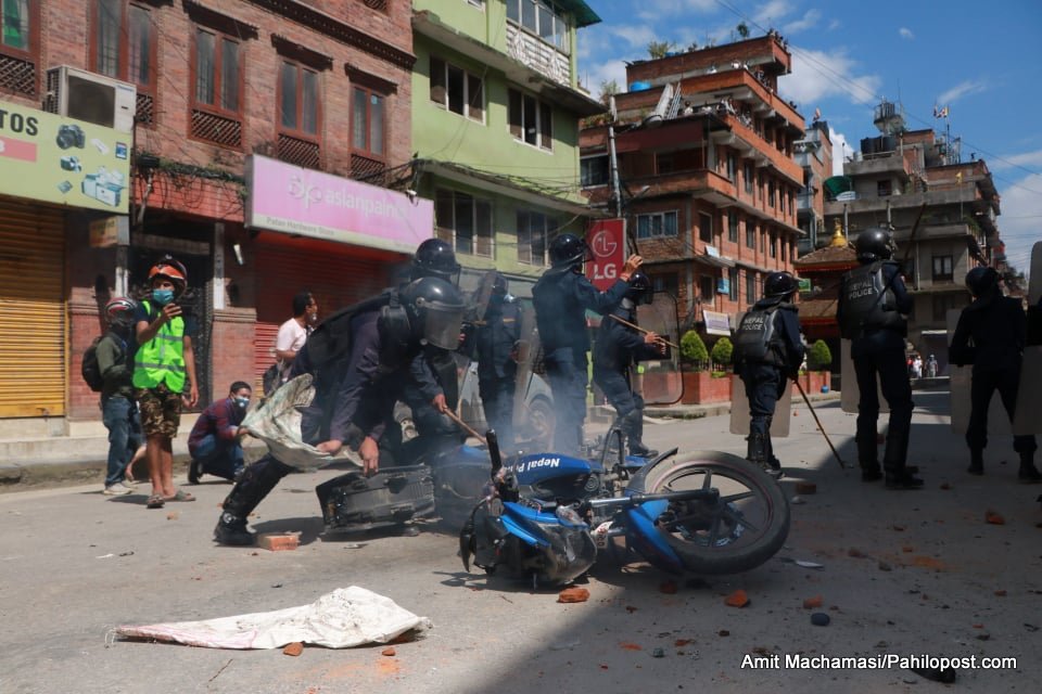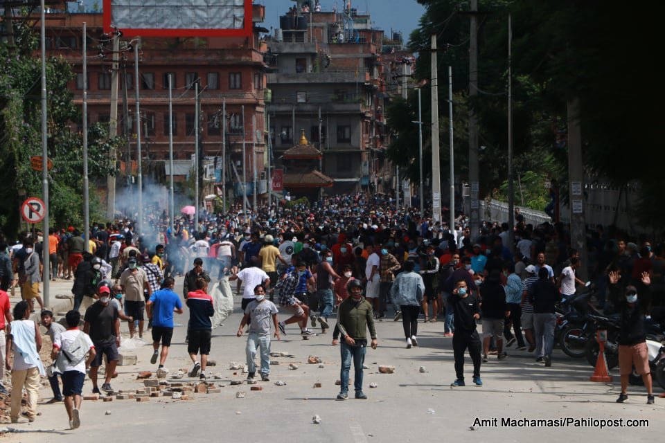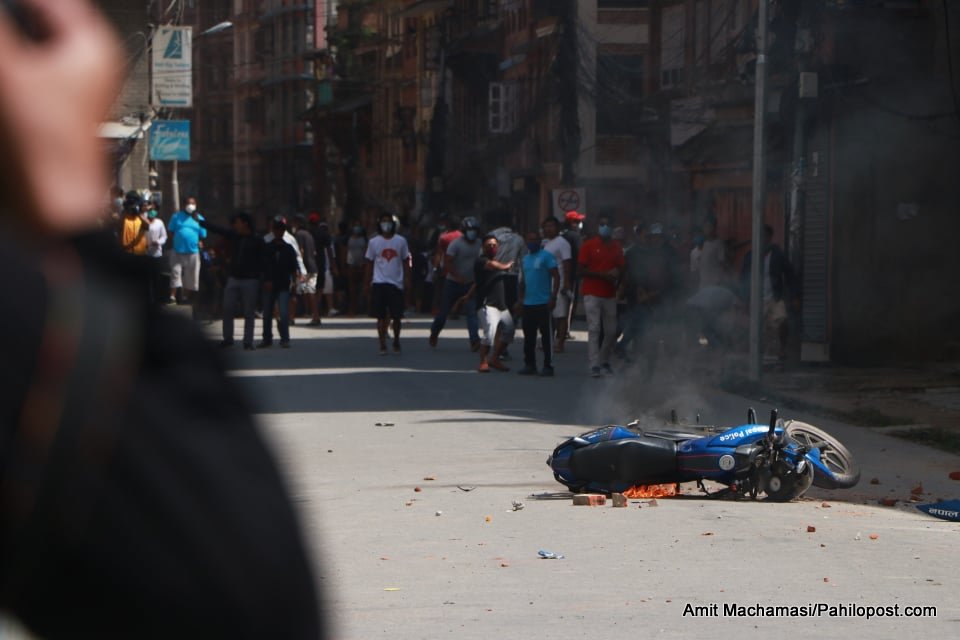 प्रहरीले अश्रु ग्यास प्रहार गर्न थालेपछि प्रदर्शनकारीले प्रहरीकै वाटर क्यानन तोडफोड गरेका थिए भने मोटरसाइकल जलाएका थिए।
