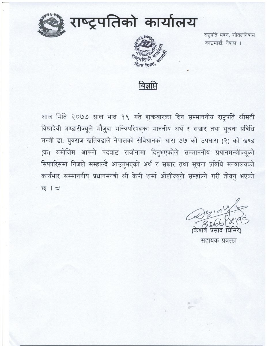पद रिक्त भएसँगै राष्ट्रपति विद्यादेवी भण्डारीले प्रधानमन्त्री ओलीलाई नै मन्त्रालयको जिम्मेवारी तोकेकी हुन्।