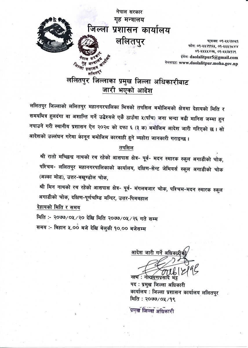 प्रशासनले रातो मच्छिन्द्रनाथको रथ रहेको आसपास क्षेत्र -पूर्वमा मदन स्मारक स्कुल अगाडिको चोक, पश्चिममा ललितपुर महानगरपालिकाको कार्यालय, दक्षिणमा सेन्ट जेभियर्स अगाडिको चोक र उत्तरमा बखुण्डोल चोकमा हुलदंगा वा अशान्ति गर्ने उद्धेश्यले एकै ठाउँ ५ जनाभन्दा बढी मानिस भेला हुन रोक लगाइएको हो।