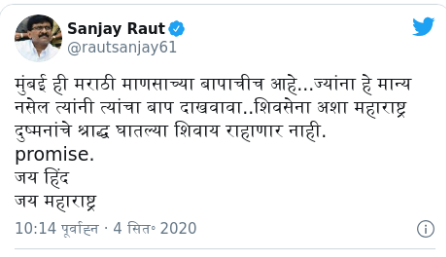 लगत्तै शिवसेना नेता संजय राउतले भनेका थिए : यदी उसलाई मुम्बई प्रहरीसँग डर लाग्छ भने मुम्बई नै नआओस्।