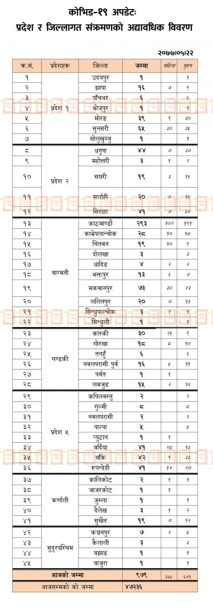 काठमाडौं : पछिल्लो २४ घण्टामा ४५ जिल्लामा कोभिड-१९ का संक्रमित पहिचान भएका छन्। देशभरका प्रयोगशालामा भएको ९ हजार २१८ परीक्षणका क्रममा ३३८ महिला र ६४१ पुरुष गरी ९७९ जना कोभिड-१९ का संक्रमित पहिचान भएको स्वास्थ्य तथा जनसंख्या मन्त्रालयको तथ्यांकमा उल्लेख छ। योसँगै नेपालमा ४७ हजार २३६ जनामा कोभिड-१९ को संक्रमण पुष्टि भएको छ।