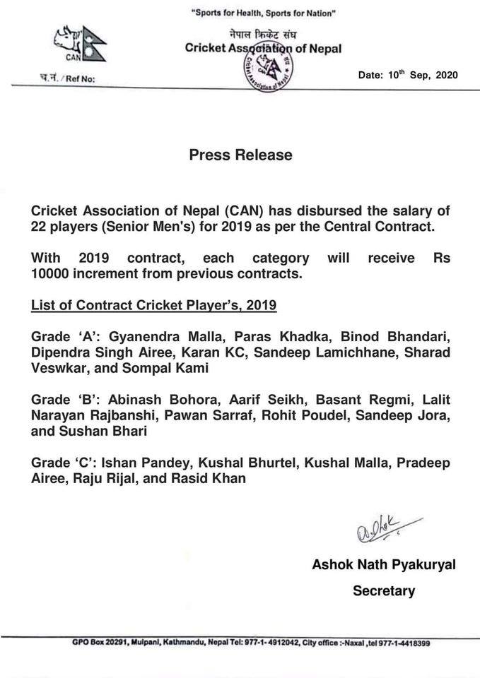 २०१८ मा आइसीसीले दुई वर्षको पारिश्रमिक राष्ट्रिय खेलकूद परिषद् (राखेप)मार्फत पठाएको थियो। त्यसयता खेलाडीहरुले पारिश्रमिक पाएका थिएनन्। क्यानले खेलाडीलाई पारिश्रमिकका लागि यसअघि तीन श्रेणीमा विभाजन गरेको थियो। त्यही अनुसार नै २२ खेलाडीका लागि आइसीसीले पारिश्रमिक उपलब्ध गराउँदै आएको थियो। ए ग्रेडका खेलाडीले मासिक ४५ हजार, बी ग्रेडकाले ३५ हजार र सी ग्रेडका खेलाडीले २५ हजारका दरले पाएका हुन्।