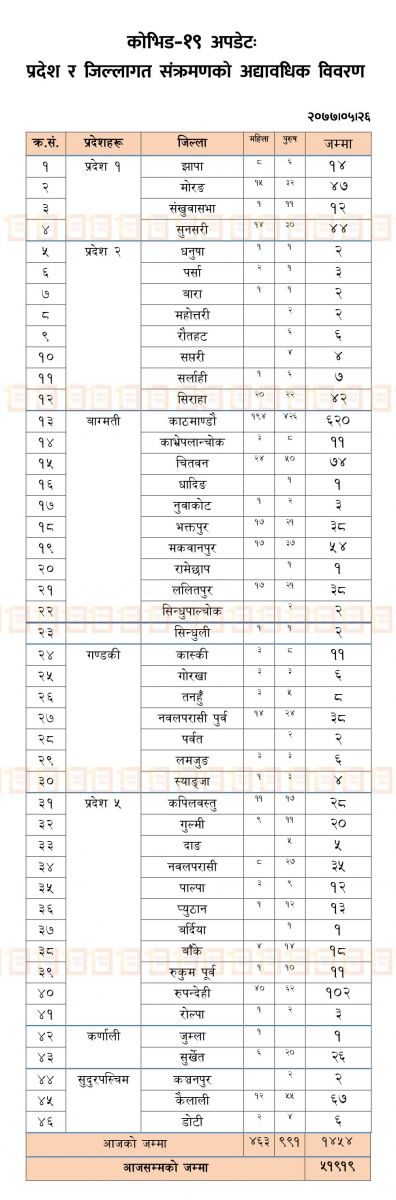 २४ घण्टामा देशभरका प्रयोगशालामा गरिएको १० हजार ७०१ परीक्षणका क्रममा ४६३ महिला र ९९१ पुरुष गरी १ हजार ४५४ जनामा संक्रमण पुष्टि भएको स्वास्थ्य तथा जनसंख्या मन्त्रालयका प्रवक्ता डाक्टर जागेश्वर गौतमले जानकारी दिए। योसँगै नेपालमा संक्रमण पुष्टि हुनेको संख्या ५१ हजार ९१९ पुगेको छ।