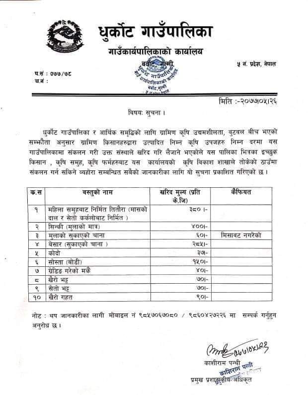 काठमाडौं : गुल्मीको धुर्कोट गाउँपालिकाले कृषकका विभिन्न कृषि उपजहरुको संकलनका लागि मूल्य निर्धारण गरेको छ।