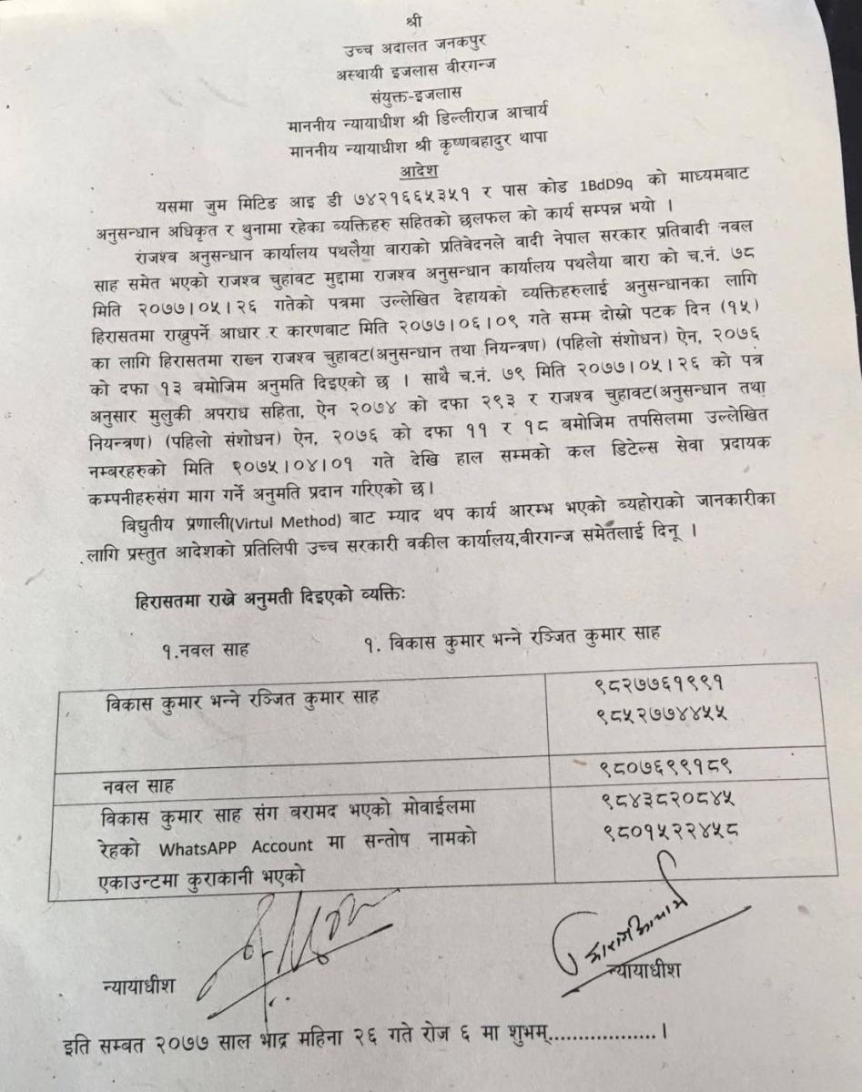 न्यायाधीशद्वय डिल्लीराज आचार्य र कृष्णबहादुर थापाको संयक्त इजलासले अभियुक्तद्वय नवल साह र रञ्जितकुमार साहलाई अनुसन्धानका लागि १५ दिन थुनामा राख्न अनुमति दिएको छ। अदालतले असोज ९ गतेसम्म थुनामा राखेर अनुसन्धान गर्न म्याद थप गरेको हो।